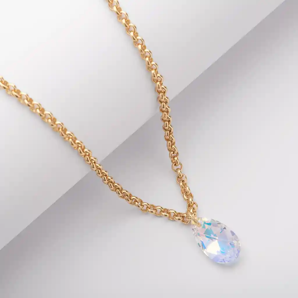 Collar Vanidosa, bañado en oro 18 kl, con Gota ab Swarovski® 28 mm Cadena eslabon rolo, bañada en oro 18 kl, hipoalergenica, libre de niquel Longitud de cadena: 45cm + 5cm alargue Cristal: Gota tornasol 28 mm de Swarovski®. Nuestras joyas vienen envueltas en papel seda y en una cajita especialmente diseñada para ustedes, traen ademas las indicaciones de los cuidados correspondientes. Si necesitas tu pedido para regalo, solicitalo en la opcion " dejar nota" y tambien podemos escribir por ti, un breve mensaje a mano