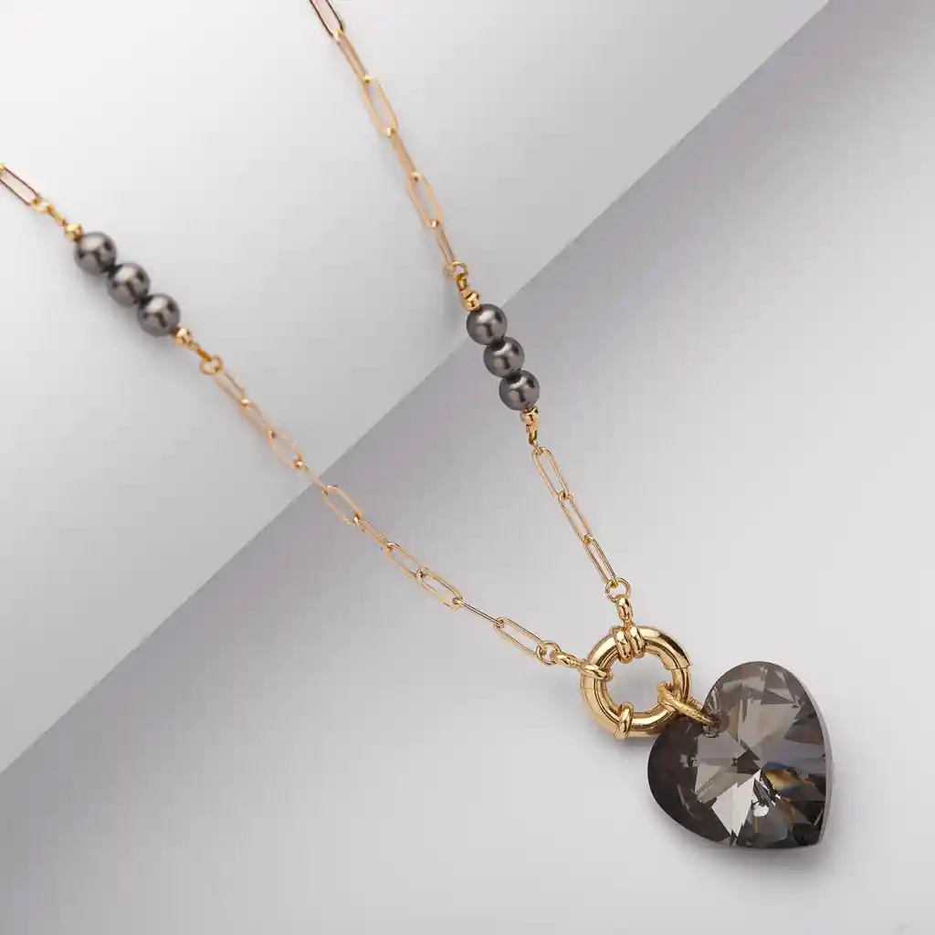Collar Vanidosa, bañado en oro 18 kl, con perlas grises y corazon 28 mm de Swarovski®- nudo timón. Cadena : bañada en oro 18 kl, libre de niquel, hipoalerge.nica Longitud de cadena: 45cm + 5cm alargue Perlas : grises, 4 mm de Swarovski. Cristal: Corazon negro 28 mm de Swarovski. Nuestras joyas vienen envueltas en papel seda y en una cajita especialmente diseñada para ustedes, traen ademas las indicaciones de los cuidados correspondientes. Si necesitas tu pedido para regalo, solicitalo en la opcion " dejar nota" y tambien podemos escribir por ti, un breve mensaje a mano