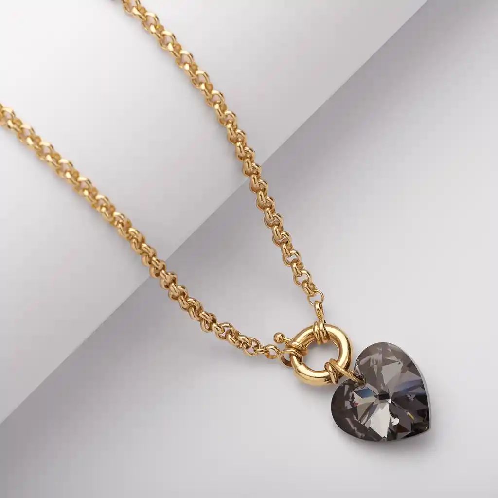 Collar bañado en oro, cadena rolo con Corazón Swarovski® negro Cadena Rolo, bañada en Oro 18k, hipoalergenica, libre de niquel Longitud de cadena: 45cm + 5cm alargue Cristal Swarovski® Corazón negro 28 mm Nudo timom: Mediano. Nuestras joyas vienen envueltas en papel seda y en una cajita especialmente diseñada para ustedes, traen ademas las indicaciones de los cuidados correspondientes. Si necesitas tu pedido para regalo, solicitalo en la opcion " dejar nota" y tambien podemos escribir por ti, un breve mensaje a mano