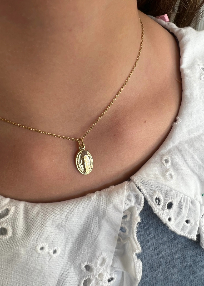 Precioso detalle para primeras comuniones y confirmaciones. Collar de 40 cm de largo con Virgen de los Rayos (la Virgen Milagros) de 13 x 9 mm y estrellita. Puedes elegir enchapada en plata o en oro 18 k, líbres de níquel e hipoalergénica