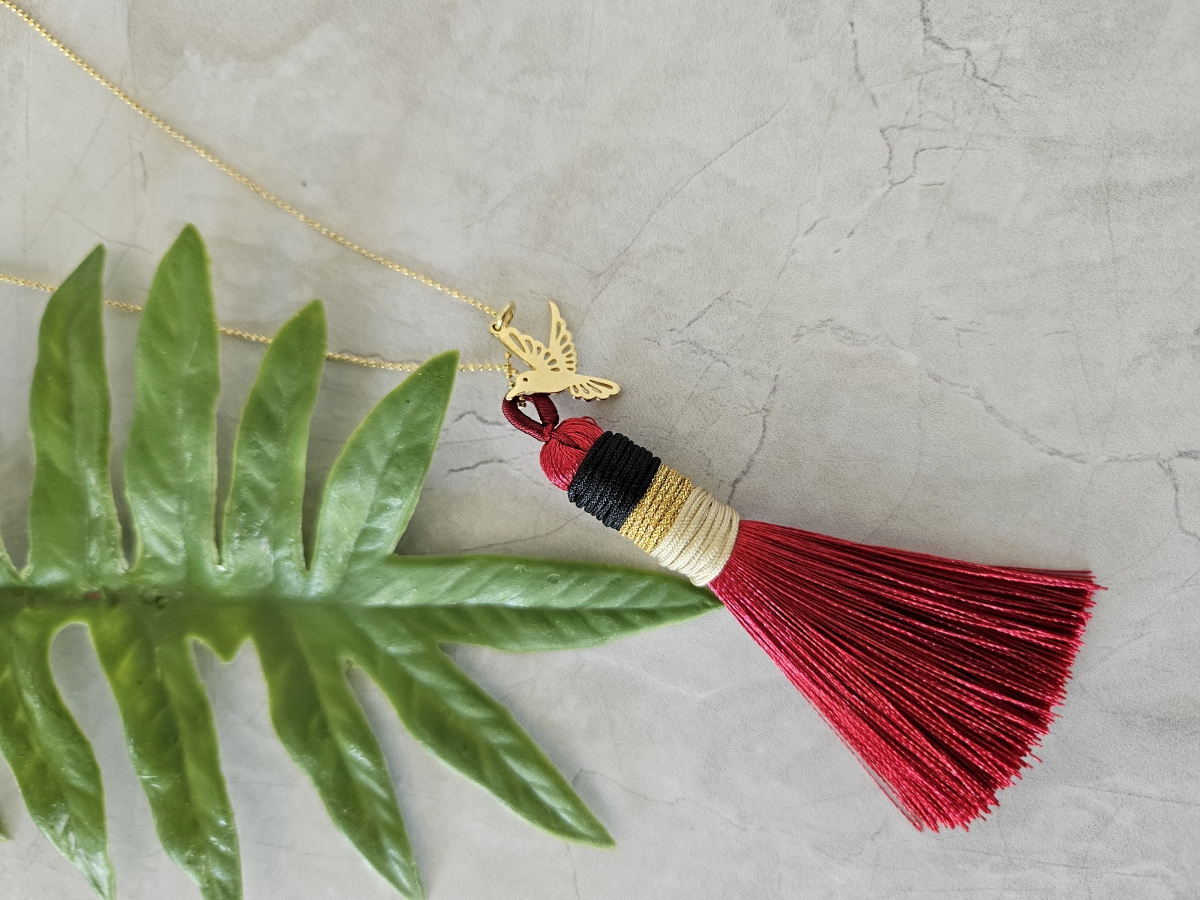 Ilumina tus outfits invernales con este entretenido collar. Borla burdeo embarrilada con hilos en tonos negro, beige y dorado, con un delicado picaflor enchapado en oro. Diseño Único. Hecho a mano en Chile. Collar a media altura de 60 cm.