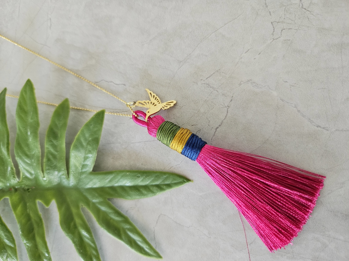 Ilumina tus outfits invernales con este entretenido collar. Borla Fucsia embarrilada con hilos en tonos verde, ocre y azul, con un delicado picaflor enchapado en oro. Diseño Único. Hecho a mano en Chile. Cadena a media altura de 60 cm.