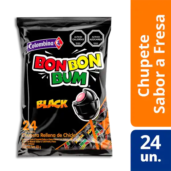 Bombón de caramelo redondo duro, sabor a fresa intensa, con relleno de goma de mascar sabor a Tutti Frutti.