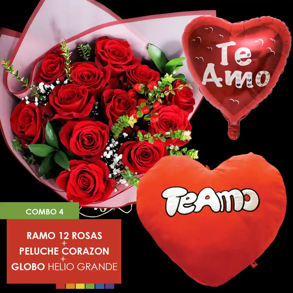 COMBO 4: RAMO 12 ROSAS, PELUCHE CORAZÓN, GLOBO HELIO.