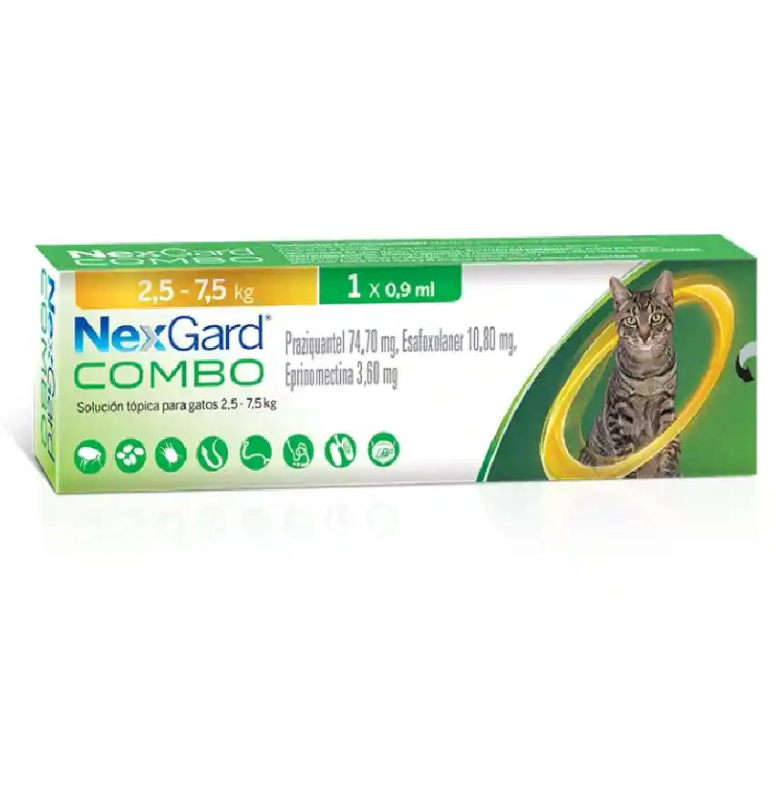 Nexgard Combo es una solución de amplio espectro diseñada especialmente para gatos, proporcionando apoyo para el control de parásitos internos y externos. Este producto está formulado para ayudar a combatir pulgas, ácaros del oído y gusanos intestinales, pulmonares y vesicales, contribuyendo al bienestar general de tu mascota.