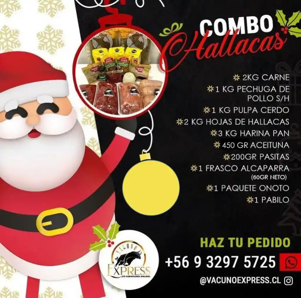 COMBO NAVIDEÑO PARA HALLACAS CON TODO INCLUIDO PARA RELIZAE ENTRE 50 A 60 HALLACAS DEPENDIENDO DEL TAMAÑO, TE INCLUYE: 2 KG DE CARNE 1 KG DE PECHUA DE POLLO SIN HUESO 1 KG DE PULA DE CERDO 2 KG DE HOJAS DE PLATANO 3 KG HARINA PAN 450 GR ACEITUNA 200 GR PASITAS 1 PAQUETE DE ONOTO 1 PABILO