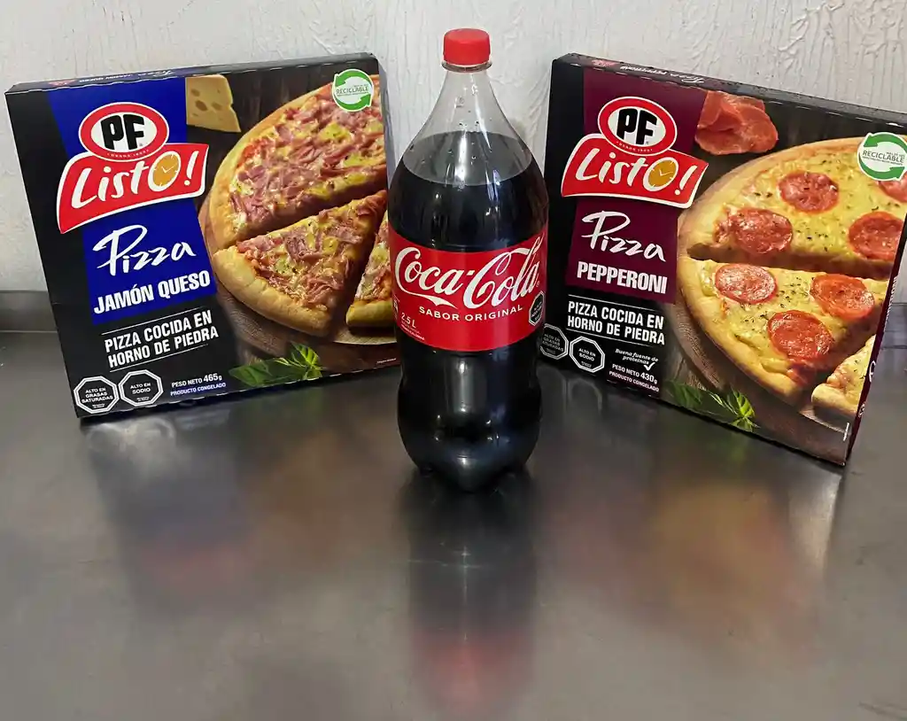 Pizzas Listas Calientes PF directo a tu hogar mas 1 Bebida 2Litros 1/2. Descripción: 1 bebida Coca Cola 2litros y medio. 1 pizza jamón queso, 1 Pizza Pepperoni, Más el toque de los Coludidos con extra queso, al horno por 15 minutos y listas para su despacho. Son pizzas PF tal cual la foto.