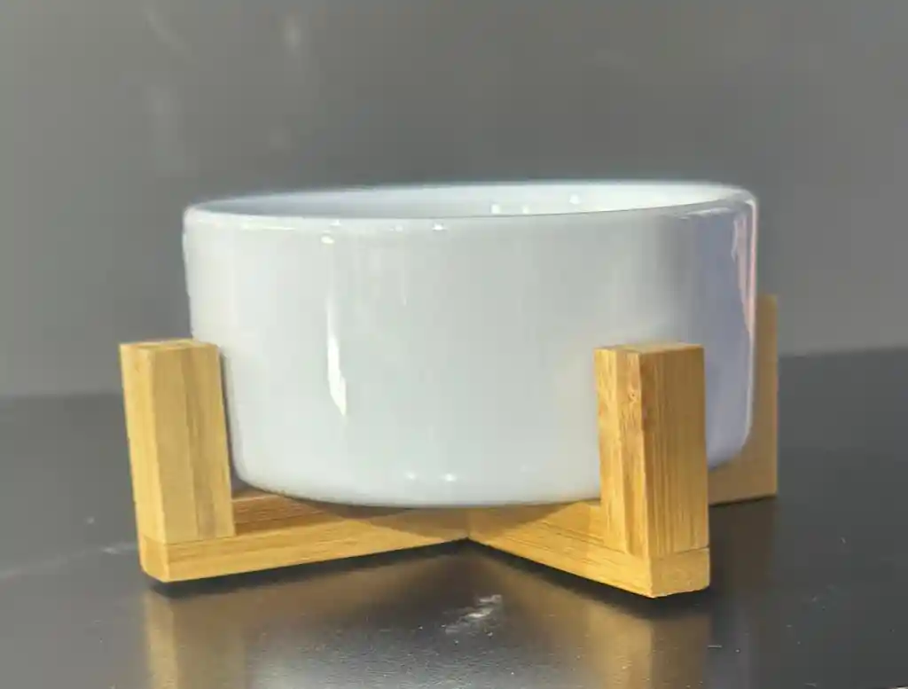 COMEDERO DE CERAMICA CON SOPORTE DE MADERA PEQUEÑO