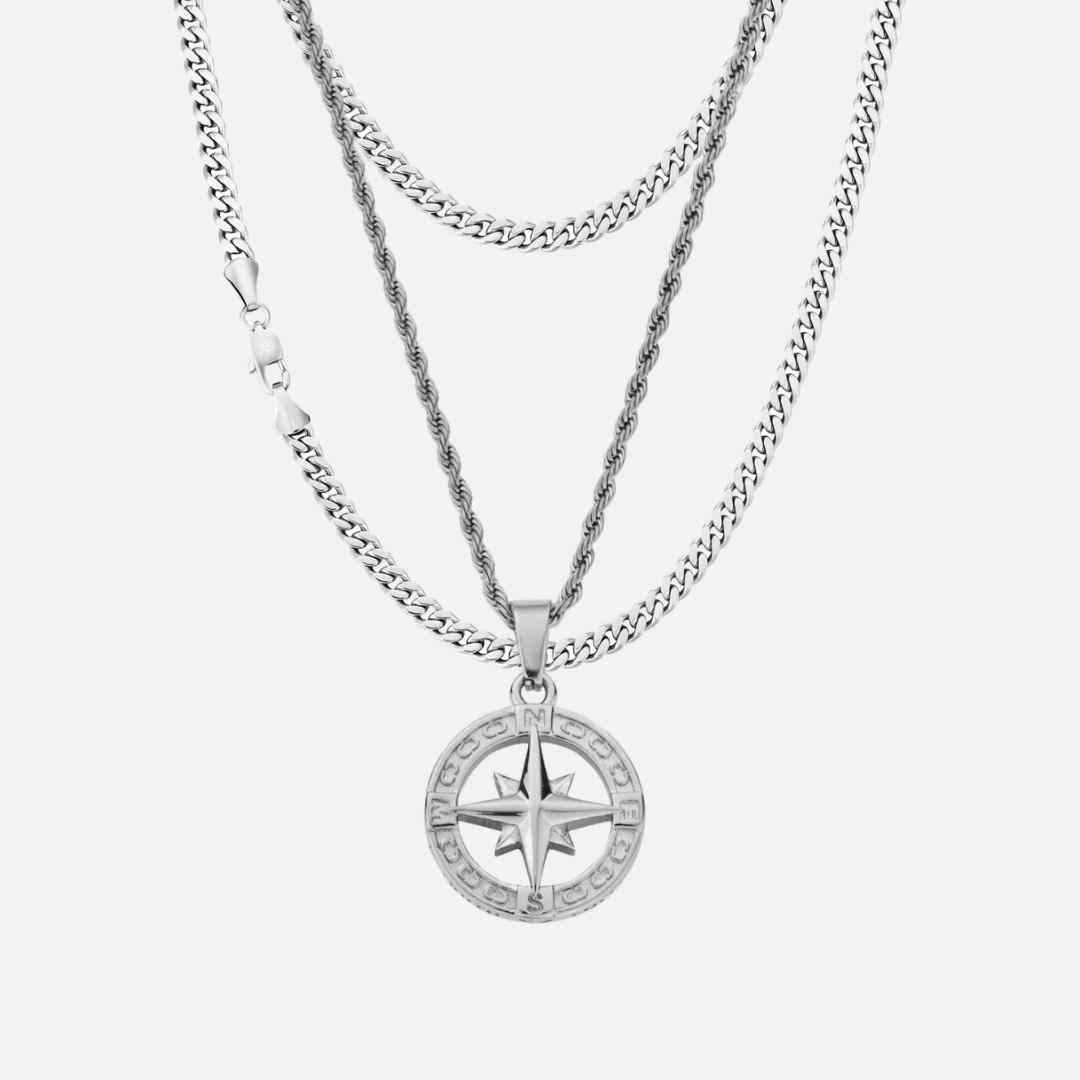 CARACTERÍSTICAS✓ Acero inoxidable 316L✓ Rodio✓ Resistente al agua, sudor y calor✓ Hipoalergénico (sin piel verde) Incluye:- Cadena Miami Cuban 5mm 50cm- Compass II Pendant + Cadena Rope 2.5mm