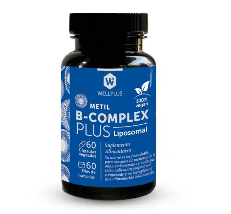 B - COMPLEX 60 CAPSULAS Aporta todas las vitaminas del complejo B e incluso B12 metilada y Biotina Estos productos son ideales para todo tipo de público y sobre todo para vegetarianos y veganos quienes tienen por lo general mayor déficit de vitamina B12. La carencia de vitamina B12 puede ocasionar una reducción de los glóbulos rojos saludables (anemia). El sistema nervioso también puede resultar afectado. El COMPLEJO VITAMÍNICO B es una combinación de 8 nutrientes hidrosolubles. Su consumo regular es esencial para el funcionamiento del cerebro, el sistema nervioso, la síntesis proteica, la fabricación de glóbulos rojos, la calidad del pelo y la piel, entre muchos otros beneficios, lo cual se encuentra ampliamente documentado en la literatura científica. Sin embargo los suplementos convencionales del complejo vitamínico B presentan problemas fármaco-cinéticos, ya que al ser un conjunto de vitaminas hidrosolubles gran parte de lo ingerido puede ser excretado en las heces y/o la orina. Sumado a lo anterior, la gran mayoría de los suplementos presentan vitaminas en formas moleculares inactivas, razón por la cual personas con ineficiencia enzimática para activar alguna de estas vitaminas, no recibirían los beneficios esperados WELLPLUS ha desarrollado una solución innovadora, el COMPLEJO VITAMINICO B ACTIVO (B1, B2, B3, B5, B6, B9, B12 y Biotina), en un formato LIPOSOMAL que maximiza su absorción intestinal.