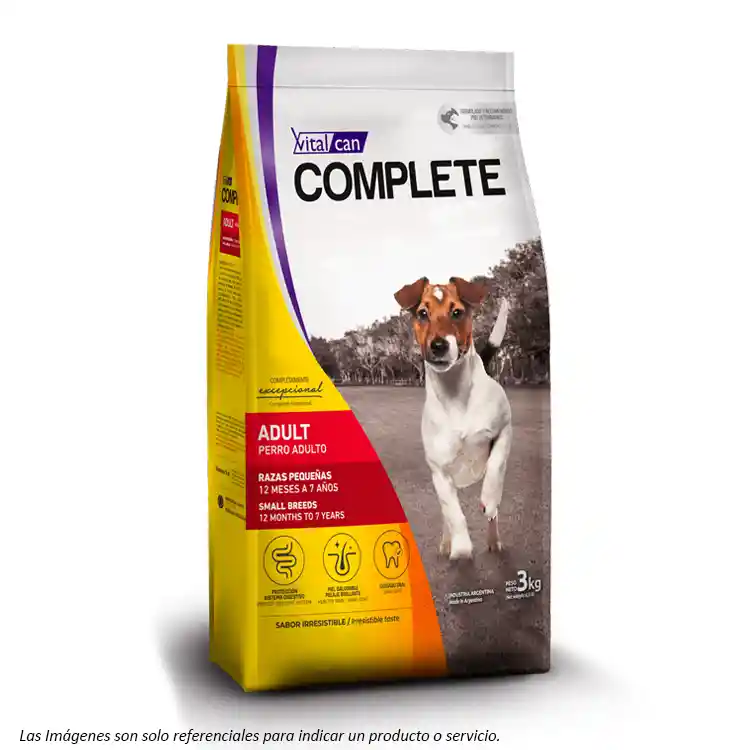 Complete de Vitalcan, es una línea de Alimento Premium para Perros Adultos de Razas Pequeñas de 1 a 7 años de edad. Con una receta a base de Carne, Pollo y Arroz, otorga un apropiado balance en su dieta, además de un irresistible sabor. Su fórmula contribuye con la protección del sistema digestivo, el cuidado oral y el mantenimiento de la piel sana y el pelaje brillante, proporcionando los siguientes beneficios: *Protección del Sistema Digestivo: Con ingredientes naturales como los prebióticos que mejoran la microbiota intestinal logrando una mejor digestibilidad y absorción de los nutrientes. *Cuidado Oral: Con Hexametafosfato de sodio, mezcla mineral que mejora la salud bucal ya que ayuda a reducir la formación de sarro. *Piel Saludable y Pelaje brillante: El Aceite de pollo, fuente de omega 6, brinda humectación a la piel y brillo al pelaje. *Calidad Garantizada, Libre de Colorantes artificiales y Envases 100% Reciclables.