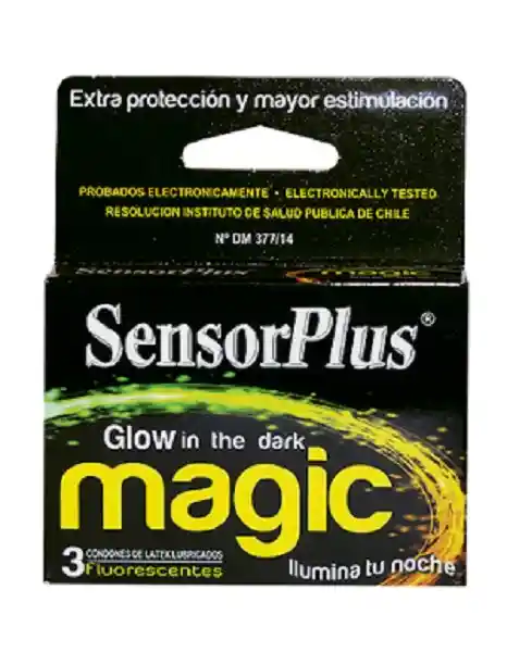 Preservativos Sensor Plus, modelo Magic. Disfruta de una noche de pasión inigualable Llévate tu caja de 3 perservativos Sensor Plus - Glow in the dark Magic Color fluorencente Contenido: 3 unidades Lubricados interior y exteriormente Dejar cargando 1 minuto al sol o luz de ampolleta unos minutos antes de usar para que se carguen Fabricados con latex natural de la mas alta calidad, y su envase sellado hermèticamente para mayor proteccion. Estan lubricados externa e internamente con dimetilsilicona. Siga cuidadosamente las instrucciones en su interior, para una buena proteccion y correcta postura del preservativo. Asi podras evitar el contagio de enfermedades de transmision sexual (ETS), incluyendo el SIDA, ademas de los embarazos no deseados. Guardese en un lugar fresco y seco, evitando el exceso de calor, ya que deteriora el material y disminuye su tiempo de vida. Contenido de cada cajita: 3 unidades.
