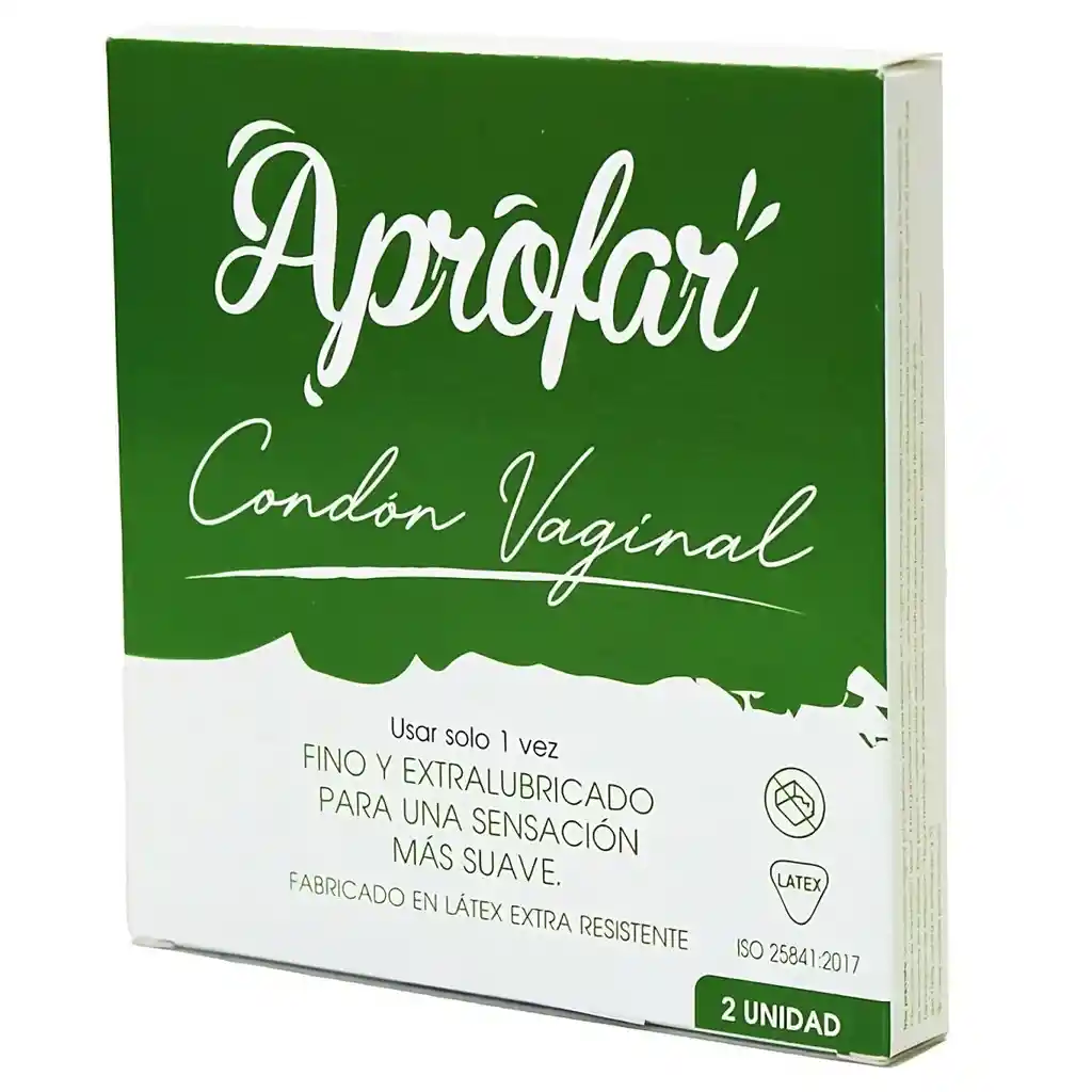 Condón interno para la vagina, que te ofrece autonomía en el bienestar sexual, así como protección contra el VIH al igual que enfermedades de transmisión sexual; además puede ser introducido hasta 3 horas antes de la relación sexual. El condón vaginal Aprofar está fabricado en látex lubricado bajo estrictas normas de calidad y respaldado por el ISP Chile para que disfrutes de tu sexualidad de manera segura. Instrucciones de uso: Abrir el empaque Tomar el condón desde el anillo exterior y apretar ambos lados Introducir en anillo dentro de la vagina Con el dedo índice empujar el condón Para la penetración guíe el pene hacia el interior del condón Al finalizar su uso, gíre el condón, retire Envuelva en el empaque el condón y deseche en la basura Medidas del condón: Largo: 17 - 18.3 cm Ancho Nominal: 80 +/- 2mm Cantidad de Lubricante: 1445-1955 mg Grosor: 0,081 – 0,100 mm