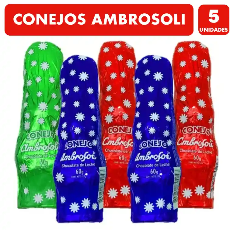 Exquisito conejo de chocolate de la marca ambrosoli. En este envase vienen 5 conejos de chocolate.