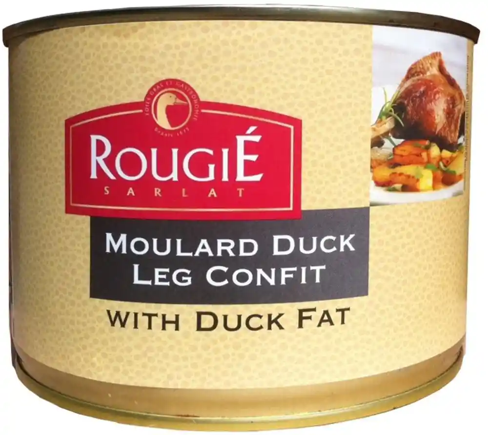CONFIT DE PATO 4 MUSLOS Pato confitado con grasa de pato Marca: Rougie Origen de la carne de pato: Francia Peso Neto: 1350g 1500g / 53 oz (4 legs) Ingredients: 4 Moulard duck legs, duck fat, water, salt, pepper * Precalentar el horno a 180ºC. Sacar el confit de pato de su envase e introducirlo en el horno a 180ºC durante 10 minutos o simplemente recalentar en sartén.