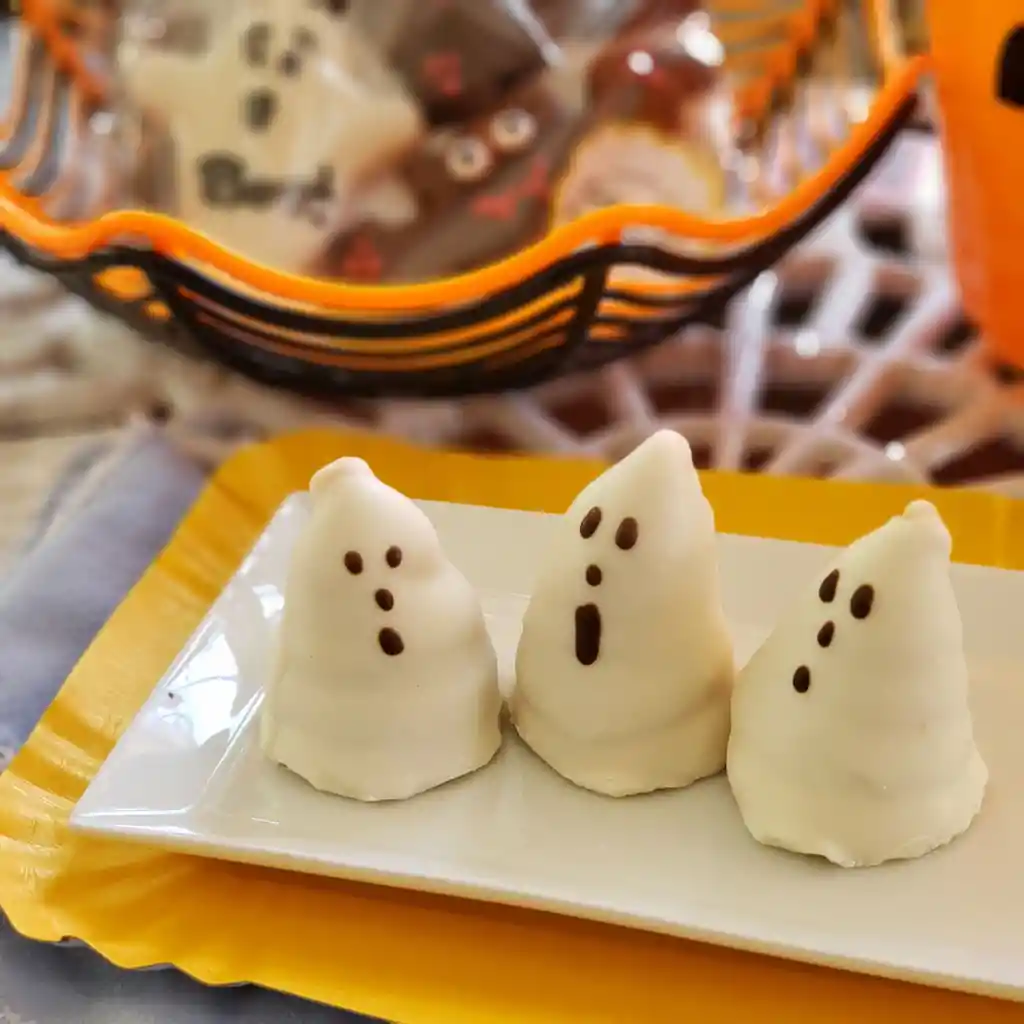 Una exquisita combinación con una base crocante: relleno de manjar de campo, cubierto con chocolate blanco y decorado de fantasma.