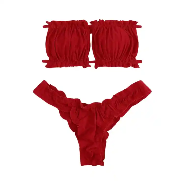 Línea Swim Este conjunto de bikini en color rojo presenta un diseño dulce y elegante, con detalles fruncidos y acaracolados que le aportan un toque femenino. Perfecto para destacar en la playa o la piscina, su top bandeau y braguita de corte alto ofrecen comodidad y estilo. Características principales: Detalles: Acaracolado y fruncido, creando una textura llamativa. Color: Rojo, vibrante y llamativo. Estilo: Dulce, ideal para un look femenino y romántico. Tipo de Estampado: Liso, sin patrones adicionales. Tipo de Bottom: Corte alto, que estiliza las piernas. Tipo de Sujetador: Sin aro, para mayor comodidad. Escote: Bandeau, sin tirantes, ofreciendo un ajuste seguro y moderno. Especificaciones técnicas: Tejido: Elástico alto, proporcionando flexibilidad y ajuste al cuerpo. Composición del material: 80% Poliamida, 20% Elastano. Forro: Incluye forro en las piezas para mayor confort. Relleno Sujetador: Almohadillas extraíbles para personalizar el ajuste. Instrucciones de cuidado: Se puede lavar en lavadora, pero no se debe limpiar en seco. TALLA M - Calzón de Bikini - Largo del bottom: 21 cm, Contorno cintura: 72-98 cm Top de Bikini - Largo de Top: 15 cm, Pecho: 92 cm