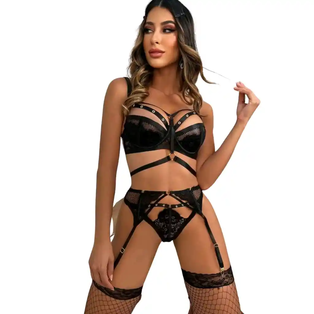 Hermoso conjunto en dos piezas incluye portaligas, calzon, media Talla disponible: M y L (indicar talla al momento de hacer la compra) Color: Negro