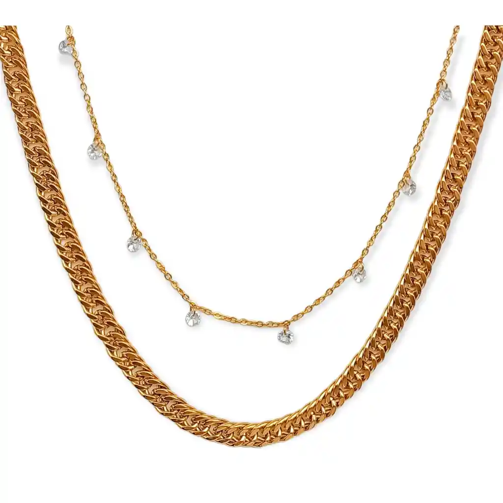 Impresionante conjunto de colgantes compuestos por cadena de eslabones estilo cubano y colgante con puntos de luz de zirconias cubicas AAA de 4mm de diametro. Ambas piezas chapadas en oro 18k que le proporcionan una resistencia y sutileza que las veras contigo por muchísimo tiempo. Este hermoso set se envía en bella presentación de regalo. Metal: Chapado en oro 18k Peso aprox 17 g Dimensiones: Cadena eslabones: 55 cm x 6 mm // Punto de luz: 45 cm + ext 5cm. (Se envía con bella caja de regalo)
