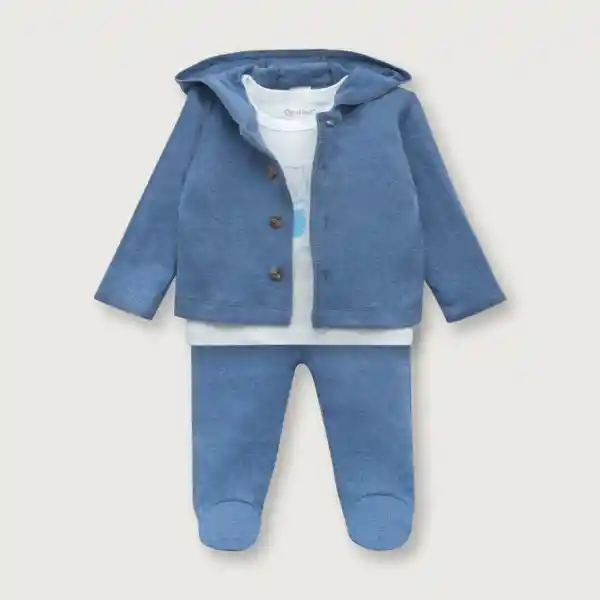 Conjunto Opaline Contiene 3 Unidades. Polera Blanca Cuello Americano Con Estampado Central De Color Azul Melange Con Pretina Elasticada Patita Cubierta Tipo Pantys. Polerón Abierto Con Botones de Plástico Ygorrito Con Tierno Detalle de Orejitas.