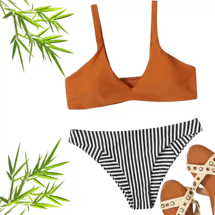 Este conjunto de bikini multicolor combina un diseño dulce y moderno con detalles a rayas y un toque liso, perfecto para disfrutar del verano con estilo. El sujetador sin aro y el escote en pico ofrecen un ajuste cómodo y favorecedor, mientras que las almohadillas extraíbles proporcionan soporte adicional. Las braguitas de bikini complementan el look con un diseño cómodo y elegante. Color: Multicolor Estilo: Dulce Tipo de estampado: A rayas Tipo de bottom: Bikini Tipo de sujetador: Sin aro, escote en 'V' Tejido: Elástico alto Material: Calzón: 82% Poliéster, 18% Elastano Sujetador: 80% Poliamida, 20% Elastano Forro: Forrado Relleno sujetador: Almohadillas extraíbles Instrucciones de cuidado: Lavar a máquina, no limpiar en seco. TALLA S - Calzón de Bikini - Largo del bottom: 21 cm, Contorno cintura: 68-94 cm Top de Bikini - Largo de Top: 18.5 cm, Pecho: 70 cm, Bajo del busto: 68 cm