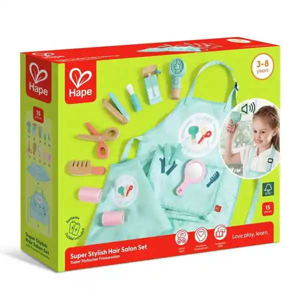 Características Adecuado para 3 años y más Sonidos realistas para el compromiso: el secador de pelo incluido produce sonidos realistas, mejorando la experiencia general de los niños pequeños y haciendo que su juego de cortar el cabello sea más atractivo y realista. Juegos de roles imaginativos: los niños pueden sumergirse en escenarios de juegos de roles imaginativos, asumiendo los roles de peluqueros y clientes. Esto fomenta la creatividad y la invención de historias únicas durante el juego. Desarrollo de habilidades motoras finas: el uso de tijeras, peines y herramientas de peinado contribuye a mejorar la coordinación ojo-mano y las habilidades motoras finas, a medida que los niños manipulan objetos pequeños. Habilidades de la vida real: las habilidades desarrolladas a través del juego, como el aseo y la comunicación, pueden traducirse sin problemas en valiosas experiencias de la vida real, brindando beneficios prácticos más allá de la sala de juegos. Familiarización con los procesos de corte de cabello: este juego ofrece una oportunidad para que los niños se familiaricen más con los procesos de corte de cabello. Esta familiaridad puede aliviar cualquier miedo o ansiedad potencial cuando tengan que someterse a un corte de pelo en la vida real. Diseño seguro y cómodo: los accesorios del juego están diseñados específicamente con bordes suaves y redondeados, lo que garantiza seguridad y comodidad para las manos pequeñas durante el juego. Descripción del Producto ¡Es hora de relajarse y divertirse en su propia peluquería! Este kit es perfecto para jóvenes estilistas que quieren expresar su creatividad diseñando peinados modernos. Anime a su hijo a actuar como peluquero utilizando las diferentes herramientas y accesorios incluidos en el kit. Puedes enseñarles técnicas básicas de peinado mientras exploran la funcionalidad de cada uno de los accesorios, como el secado con secador y el corte. ¡Todos los elementos son duraderos y están hechos para durar, para que su hijo pueda disfrutar de horas de diversión peinándose!