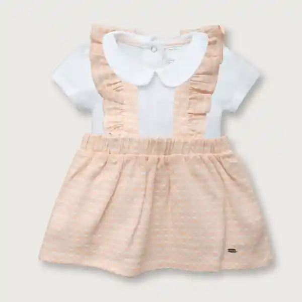 Conjunto Opaline Contiene 2 Unidades. Jumper Cuadrille en Tonos Blancos y Damasco Con Tirantes Con Vuelitos en Frente y Espalda. Botones de Nacar en Espalda Para Poder Ajustar su Medida. Bodies de Color Blanco Manga Larga Con Cuello Peter Pan y Broches en Espalda y Entre Piernas.