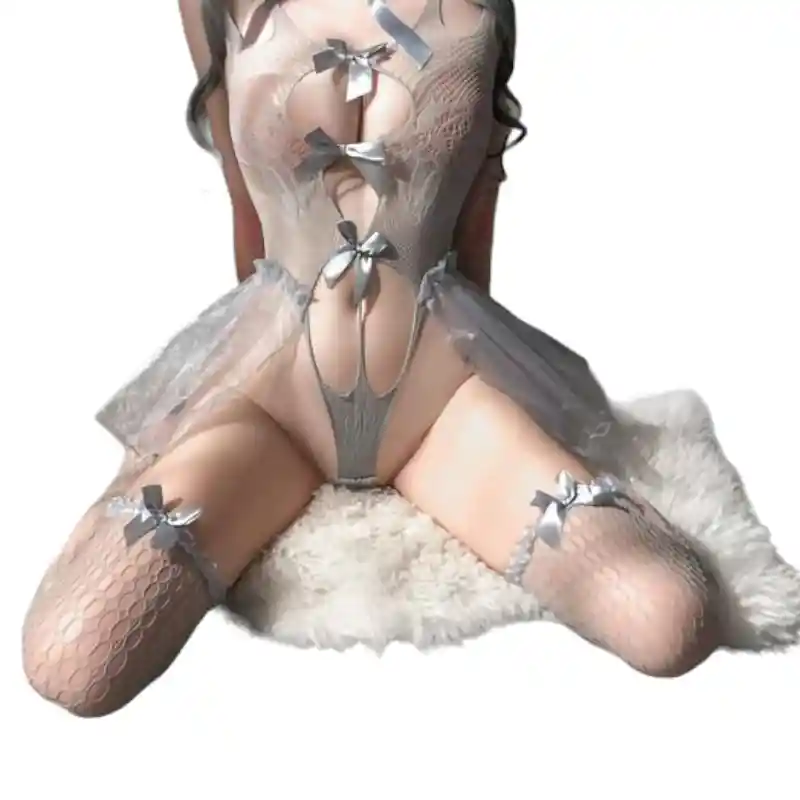 Conjunto malla gris. Incluye: Body malla con tutú, medias red grises, cintas muñecas y cuello.