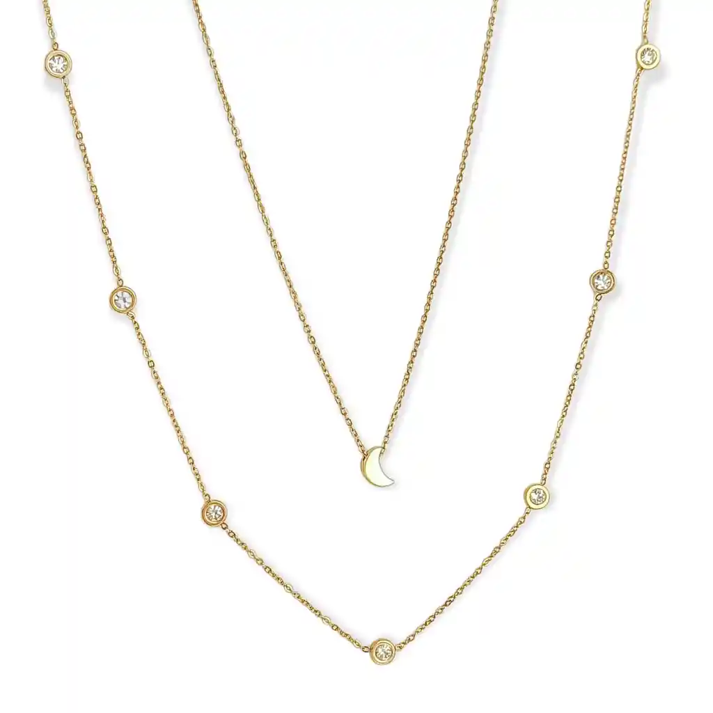 Conjunto de colgantes multicapa compuesto por colgante largo con bellas zirconias que se reflejan como puntos de luz sumado a ella se encuentra una bella luna que hace juego con esta bella constelación, su chapado en oro 18k de alta calidad le proporcionará la resistencia y durabilidad que deseas en una joya de este nivel. Metal: Chapado en oro 18k Peso aprox 17 g Dimensiones: Cadena larga: 57 + 5 cm (Extensión) de largo // Cadena luna: 45cm de largo Todas tus joyas son enviadas en bella presentación de regalo. ----------------------------------------------------------------------------------------------------------------------------------------------------------------------------------------------------------------------------- Ofrecemos joyas únicas, que cuentan historias especiales. Contamos con una amplia variedad de joyas de metales preciosos, gemas y arte adaptados a los gustos de nuestros clientes. Además, ofrecemos auténticas piedras preciosas de la mejor calidad. Descubre nuestros productos en plata, oro, oro rosa y acero quirúrgico 316L, perfectos para cualquier ocasión. Encuentra el regalo u obsequio perfecto para navidad, dia de reyes, cumpleaños, San Valentín, aniversario, día de las madres, día del padre, graduaciones, bodas, obsequios para niñas, niños, para dama, caballeros, viajeros y más. ¡Regalos originales y obsequios para todo tipo de fanáticos y amantes de la vida!