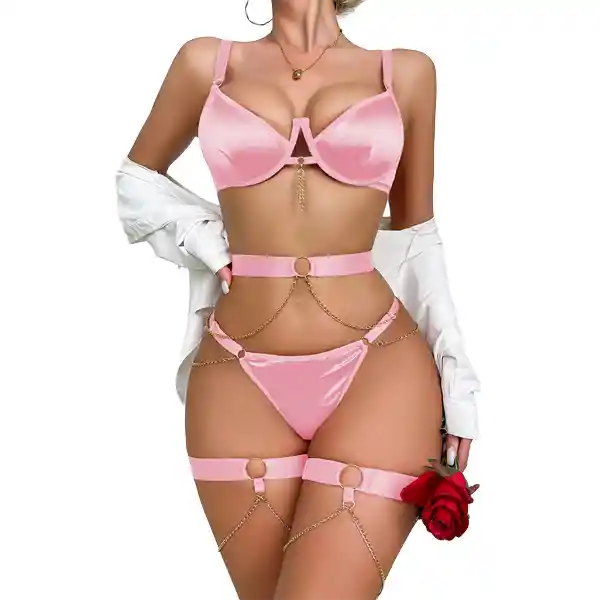 💕 Conjunto Rosa de Satén con Cadenas y Arnés – Talla L Una combinación irresistible de suavidad y actitud ✨. Este conjunto en satén rosa con detalles metálicos dorados realza la figura con un estilo glam y atrevido, perfecto para una ocasión especial. 🔥 Sujetador con aro y tirantes regulables ⛓️ Cadenas decorativas y detalle tipo arnés 💖 Cinturilla alta que estiliza la silueta 👙 Tanga a juego en satén sedoso Diseñado para sentirte segura, femenina y absolutamente impactante.