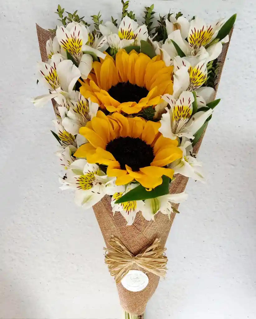 Hermoso cono de girasoles con alstromelias especial para Sorprender a Mamá en su día.