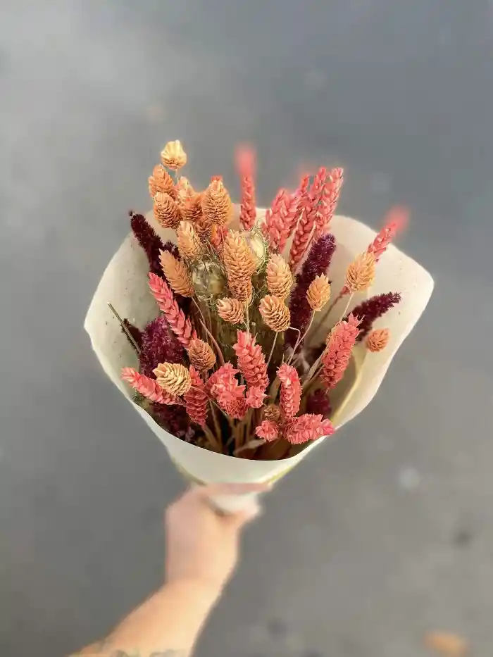 Este pequeño mix está inspirado en países exóticos. Incluye un mix de flores secas holandesas en tonos naranjos, burdeos, beige y rosados. Largo aproximado 30 cms. Todos nuestros productos secos y preservados han sido cuidadosamente seleccionados e importados desde Holanda para ti. Además todos han sido cultivados, cosechados y producidos de manera manual para garantizar la mejor calidad y color, respetando las normativas eco-sustentables europeas. Nuestros productos pueden durar varios años si se cuidan de la manera correcta evitando el sol directo, cambios de temperaturas muy abruptos, exposición a espacios húmedos, contacto directo con el agua, inadecuada manipulación, entre otros. *Por tratarse de un producto natural, al igual que nuestros ramos de flores frescas, nunca habrán dos ramos exactamente iguales.