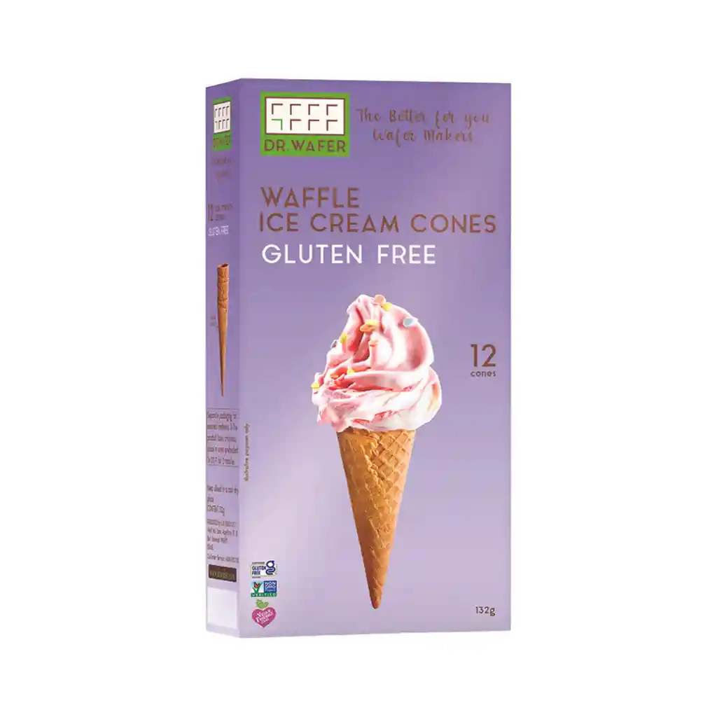 Crujientes conos para helado de barquillo sin gluten. Vegano | Sin gluten | Non GMO | Kosher Ingredientes: Almidón de tapioca, Azúcar, Emulsionante (lecitina de soya), Fibra dietética (celulosa), Estabilizante (Goma Xanthan), Cacao en polvo reducido en grasa, Sal, Aromatizante (Vainilla). Puede contener trazas de avellana.