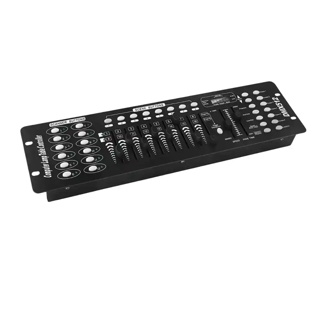 Control de voz disponible para que pueda controlar fácilmente el efecto de iluminación con su voz, para que pueda cambiar sin esfuerzo entre diferentes escenas de iluminación ahorrando tiempo y energía, perfecto para DJ, clubes nocturnos, reuniones familiares, bodas, reuniones de la iglesia, etc. Agregue más energía a sus espectáculos Con 192 grupos de canales, controla hasta 12 luces inteligentes de hasta 16 canales cada una, también puede controlar hasta 12 dispositivos y hasta 240 escenas, lo que le permite configurar espectáculos complejos. Micrófono integrado para activación de música, micrófono integrado para activación de música. 192 canales DMX, 8 controles deslizantes para control manual de canales. 30 bancos de 8 escenas programables.
