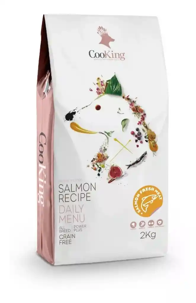Alimento de gran valor nutricional para perros, con alto contenido de ingredientes frescos, libre de granos. Cooking es fabricado por Elmubas en Europa, una de las fábricas de alimentos más grandes del mundo y con más de 30 años de experiencia en el sector, alimentando a millones de mascotas en 27 países, con rigurosos protocolos de calidad, garantizando un óptimo producto. Sus alimentos son cuidadosamente elaborados en una morderna planta de producción, en la que rigurosamente, sólo la mejor carne fresca, es seleccionada para obtener un mayor sabor y valor. Ingredientes: Pescado (salmón fresco mínimo 20%), papas, legumbres, grasa de pollo, levadura de cerveza, salmón, hidrolizado de hígado de pollo, aceite de pescado rico en omega 3, hortalizas (achicoria, zanahoria, habas verdes, colinabo), sustancias minerales, extracto de yucca schidigera, fibra de manzana, complejo condroprector (hidroclorato de glucosamina, sulfato de condroitina, MSM, extracto de mejillón de labios verdes), manano-oligosacáridos, fructo-oligosacáridos, taurina, botánicos (caléndula, salvia, fenogreco, eneldo, tomillo), prebióticos, extractos vegetales (frutos rojos, semilla de cardo mariano, semilla de té verde, romero), antioxidante.