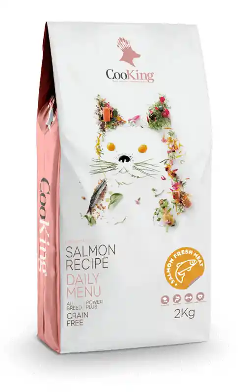 Receta de salmón para gatos adultos es un alimento cuidadosamente formulado y elaborado con más del 30% de pescado crudo y carne de pollo fresca aportando proteínas de alto valor biológico y bajo contenido en carbohidratos ya que es una receta sin cereales. INGREDIENTES: Pescado (mínimo 30% en equivalente crudo), papas, carne y derivados animales (carne fresca de pollo mínimo 20%), legumbres, grasa de pollo, levadura de cerveza, hidrolizado de hígado de pollo, aceite de salmón rico en Omega 3, hortalizas (achicoria, zanahoria, habas verdes, colinabo), sustancias minerales, lignocelulosa, fibra de manzana, complejo condroprotector (hidroclorato de glucosamina, sulfato de condroitina, MSM, extracto de mejillón de labios verdes Perna canaliculus), taurina, manano-oligosacáridos, fructo-oligosacáridos, botánicos (caléndula, salvia, fenogreco, eneldo, tomillo, escaramujo), extracto de Yucca schidigera, prebióticos, extractos vegetales (frutos rojos, cítricos, semilla de cardo mariano, semilla de té verde, menta, romero), antioxidante naturales, probióticos (E. faecium). Contiene: 2 kilos