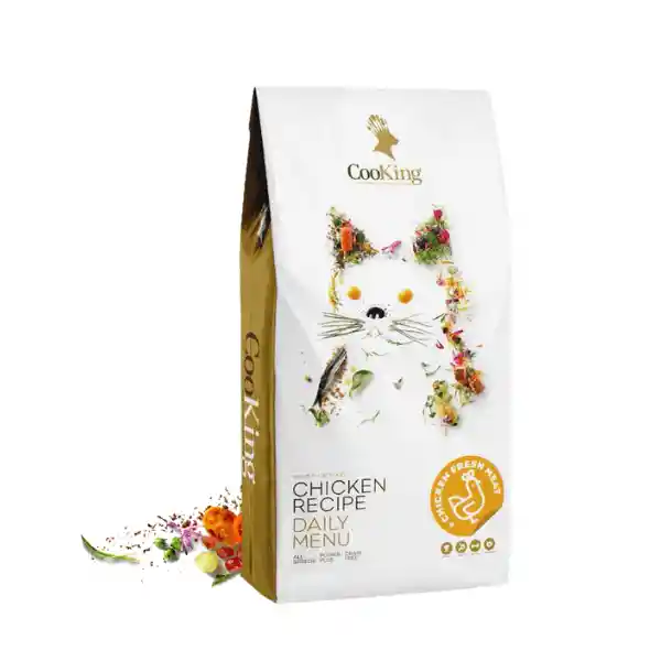 Receta de carne fresca de pollo para gatos adultos es un alimento completo y equilibrado, sin cereales, con pollo fresco, salmón y legumbres. Una receta creada para deleitar el paladar de los más exigentes, un menú fresco, sano, sabroso y nutritivo que aporta todos los nutrientes que su gato necesita. • Ingredientes o Carnes (carne fresca de pollo mínimo 20%), papas, salmón, legumbres, grasa de pollo, levadura de cerveza, atún, hidrolizado de hígado de pollo, aceite de pescado rico en Omega 3, hortalizas (achicoria, zanahoria, habas verdes, colinabo), sustancias minerales, lignocelulosa, fibra de manzana, complejo condroprotector (hidroclorato de glucosamina, sulfato de condroitina, MSM, extracto de mejillón de labios verdes Perna canaliculus), taurina, manano-oligosacáridos, fructo-oligosacáridos, botánicos (caléndula,salvia, fenogreco, eneldo, tomillo, escaramujo), extracto de Yucca schidigera, prebióticos, extractos vegetales (frutos rojos, cítricos, semilla de cardo mariano, semilla de té verde, menta, romero),antioxidantes naturales, probióticos (E. faecium).