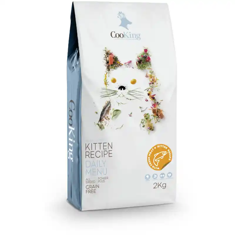 Receta cuidadosamente formulada por veterinarios y nutricionistas que proporciona una combinación única de alimento energético rico en proteínas. Cocinado con más de 30% de pescado, carne de pollo fresca, legumbres, hortalizas, este menú de sabor intenso y sabroso conquistará el paladar del felino más exigente. BENEFICIOS -Carne fresca de salmón y pollo -Formulado sin cereales y sin gluten -Saco con cierre Zip -Para gatitos Ingredientes principales Salmón Pollo Patata: fuente de hidratos de carbono, adecuado para perros con intolerancia a los cereales. COMPOSICIÓN Pescado (min. 35% en equivalente crudo), patata, carne y derivados animales (carne fresca de pollo mínimo 20%), legumbres, grasa de pollo, levadura de cerveza, aceite de salmón rico en 3, hidrolizado de hígado de pollo, hortalizas (achicoria, zanahoria, habas verdes), fibra de manzana, sustancias minerales, lignocelulosa, taurina, complejo Condroprotector (hidroclorato de glucosamina, sulfato de condroitina, MSM, extracto de mejillón de labios verdes Perna canaliculus), manano-oligosacáridos, fructo-oligosacáridos, botánicos (caléndula, salvia, fenogreco, eneldo, tomillo, escaramujo), extracto de yucca schidigera, prebióticos, extractos vegetales (frutos rojos, cítricos, semilla de cardo mariano, semilla de té verde, menta, romero), antioxidantes naturales, probióticos (E. faecium). DATOS TÉCNICOS Componentes analíticos: Proteína 37%, Fibra 1%, Grasa 18%, Cenizas 7%, Taurina 1.700mg/Kg, Omega 3 0,55%, Omega 6 2,09%, Condroitina 885mg/Kg, Glucosamina 1.370mg/Kg, Calcio 1,4%, Fósforo 0,9%. Valor energético: 4.168 Kcal./kg