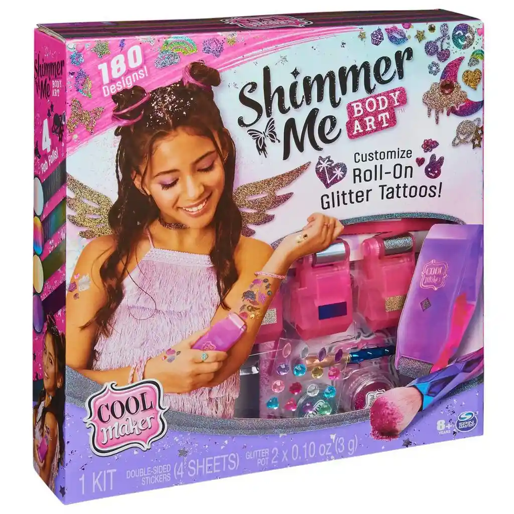 Este kit todo en uno tiene todo lo que necesitas para diseñar y personalizar tu propio arte corporal roll-on temporal: 4 láminas, 2 colores de purpurina, brocha de purpurina, gemas, rodillo y 180 diseños. Inserte un cartucho de aluminio en el rodillo y gírelo sobre la pegatina para revelar su arte corporal. Los tatuajes duran aprox. 24 horas; El adhesivo seguro para la piel se quita fácilmente con agua tibia. Elige entre 180 modernos diseños de pegatinas de doble cara y dale estilo a tu arte corporal, ¡a tu manera! ¡Mezcla y combina diseños y papel de aluminio, luego decora tu look con purpurina y gemas. Shimmer Me Body Art incluye 4 láminas fabulosas (plateado, dorado, rosa / morado y arcoíris) para crear fácilmente tus looks. Cada cartucho tiene 42 pulgadas de papel de aluminio: diseñe, enrolle y revele una y otra vez. Se recomienda de 8 años en adelante.