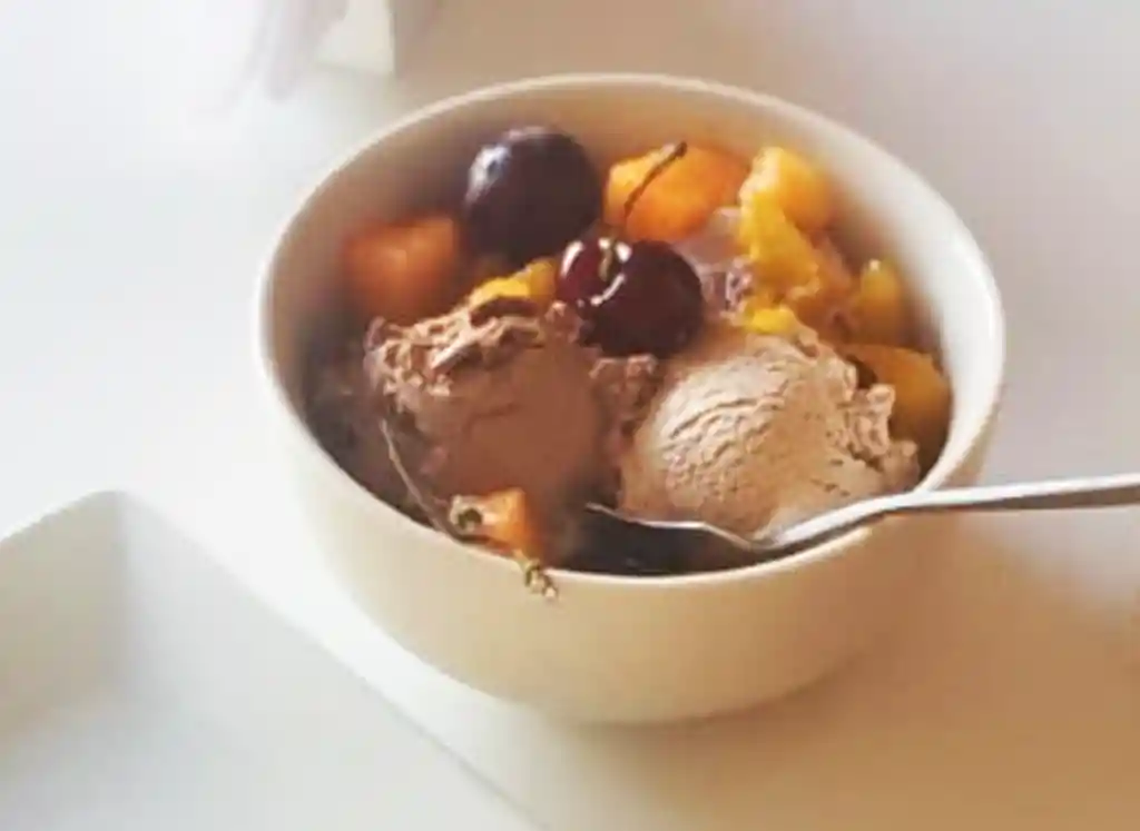 Copa de helado con frutas de estación . 3 sabores a elección (ver sabores del día)