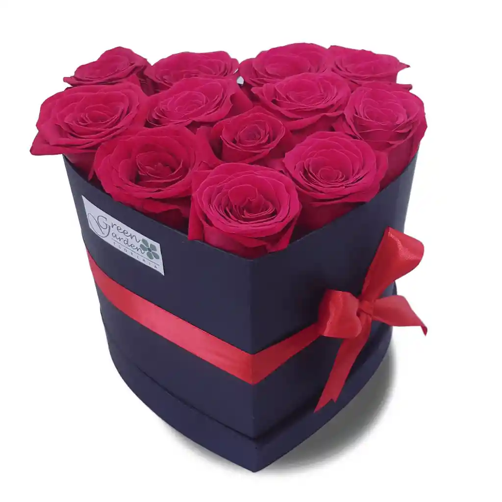 14 rosas ecuatorianas en bella caja de forma de corazón, decorado con lazo de raso