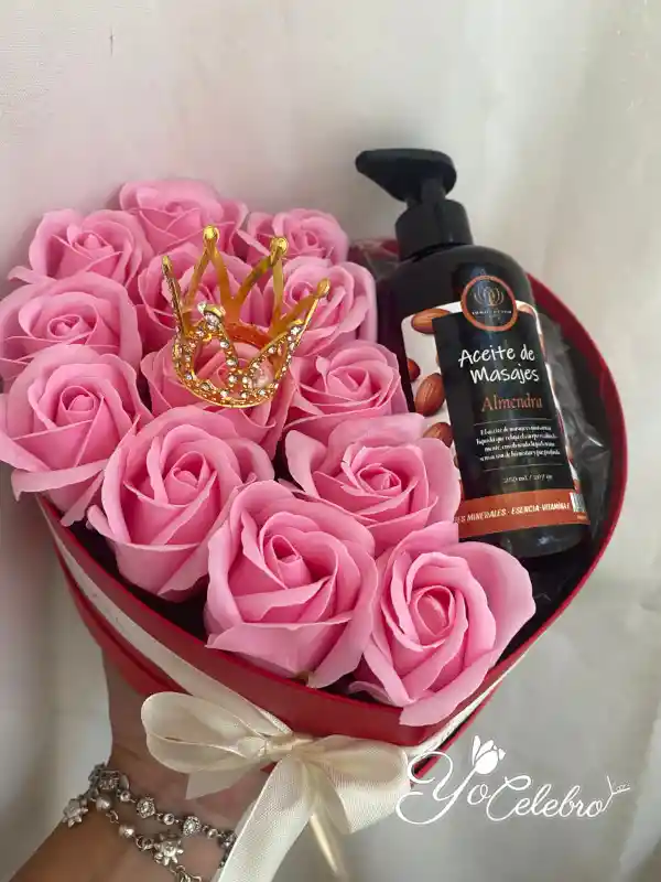 Caja en forma de Corazón con Rosas de Jabón aromáticas y Aceite para Masajes en dos aromas que puedes elegir; Almendras o Coco. Las rosas de jabón son pétalos de jabón que se pueden usar para decorar, regalar o disfrutar en el baño. NOTA: Las rosas de jabón no son flores naturales.