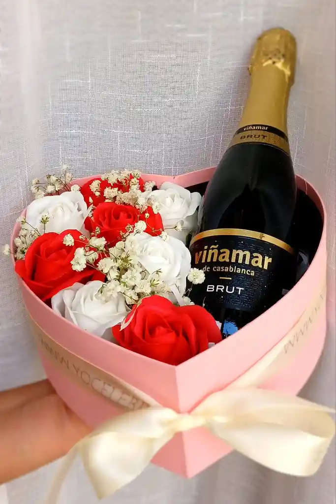 Corazón con Rosas de Jabón aromáticas y Espumante. Las rosas de jabón son pétalos de jabón que se pueden usar para decorar, regalar o disfrutar en el baño. NOTA: Las rosas de jabón no son flores naturales.