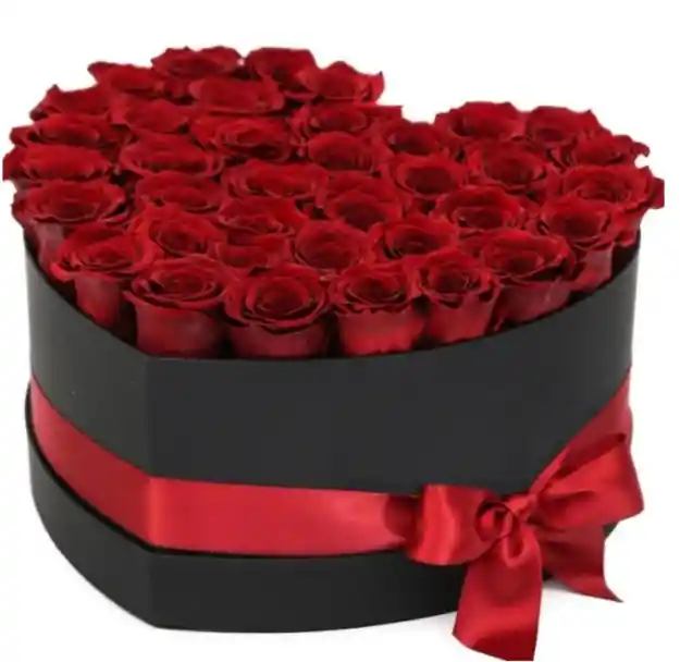 Caja elegante en forma de corazón conformada por 30 rosas rojas en espuma floral decorada con lazo de cinta satín