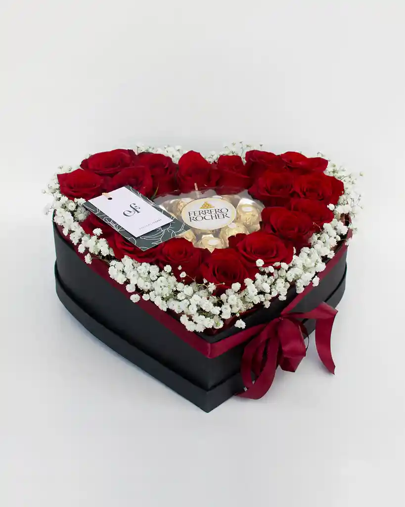 Corazon de 18 rosas bordeado de gipsofilas, con centro de bombones Ferrero rocher