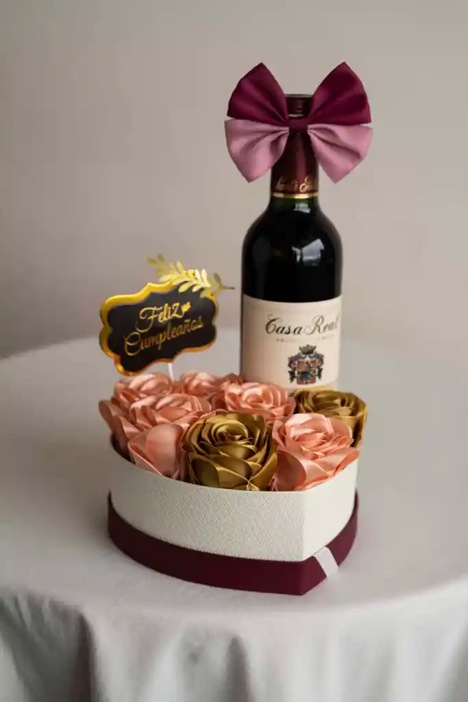 7 Rosas eternas 1 Botella de vino Cabernet Sauvignon 375 cc Base de cartón caja diseño corazon