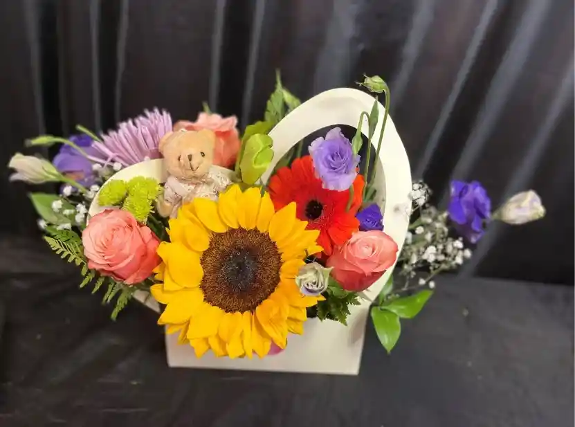 ARREGLO EN BASE DE CORAZON COMPUESTA DE MIX FLORAL Y PELUCHE MINI. COLORES DE CAJA DE CORAZON DISPONIBLE, BLANCA Y ROJA