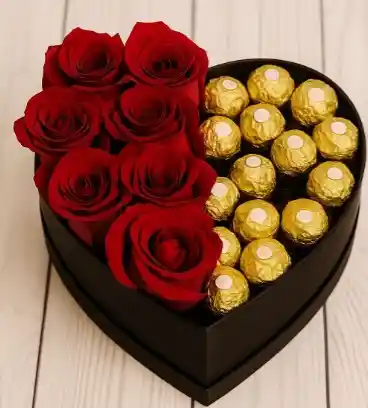 HERMOSO ARREGLO FLORAL DE CORAZON NEGRO CON 7 ROSAS ROJAS Y 11 BOMBONES PARA CUALQUIER OCASIÓN