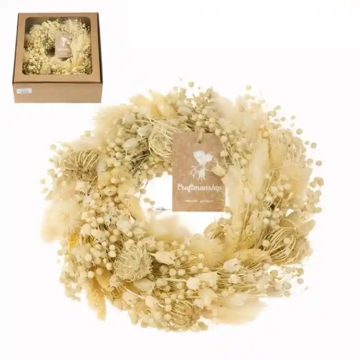 Esta corona de flores secas es ideal para decorar una puerta o para ser usada como centro de mesa. Incluye un mix de flores secas holandesas en tonos naturales. Este producto viene presentado dentro de una caja como se ve en la foto. Ancho aproximado 30 cms. Todos nuestros productos secos y preservados han sido cuidadosamente seleccionados e importados desde Holanda para ti. Además todos han sido cultivados, cosechados y producidos de manera manual para garantizar la mejor calidad y color, respetando las normativas eco-sustentables europeas. Nuestros productos pueden durar varios años si se cuidan de la manera correcta; evitando el sol directo, cambios de temperaturas muy abruptos, exposición a espacios húmedos, contacto directo con el agua, inadecuada manipulación, entre otros. *Por tratarse de un producto natural, al igual que nuestros ramos de flores frescas, nunca habrán dos ramos exactamente iguales.