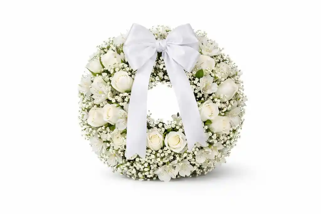 Corona elaborada con 10 rosas eternas, follaje de temporada y lazo grande